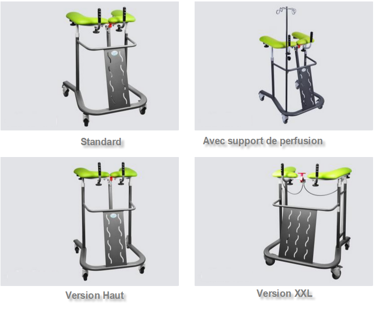 L’aide est disponible en différentes versions. Il existe notamment le Walker H destiné aux personnes de grande taille, le Walker Maxi pour les personnes plus obéses, le Walker avec support pour perfusion, le Walker avec freins à main ainsi que le Walker avec réglage électrique de la hauteur.