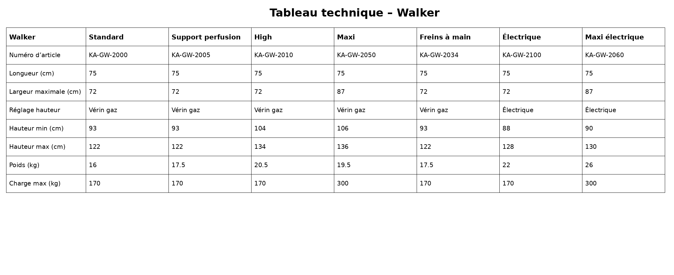 Walker H destiné aux personnes de grande taille, le Walker avec support pour perfusion,le Walker avec freins à main ainsi que le Walker avec réglage électrique de la hauteur