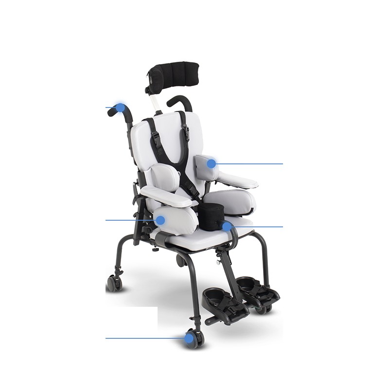 Équipements standards : Châssis avec réglage en hauteur – Dossier avec réglage progressif et sans à-coups de la hauteur et de l’inclinaison – Ceinture pelvienne – Repose-pieds amovible avec réglage progressif de la hauteur, de l’extension et de l’inclinaison – Sangles de stabilisation des pieds.