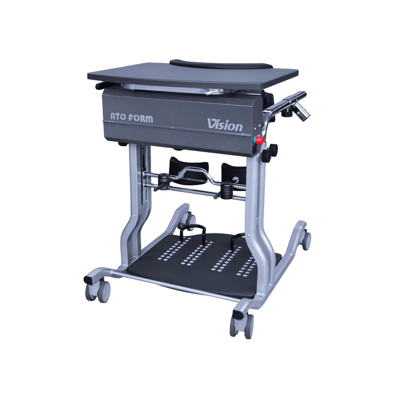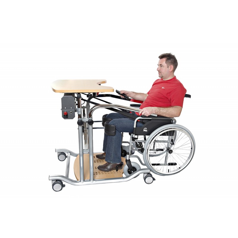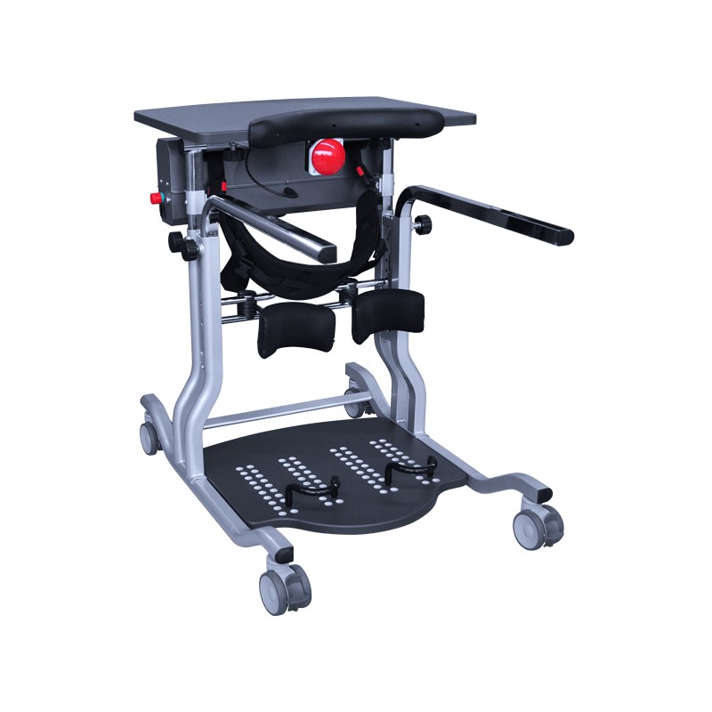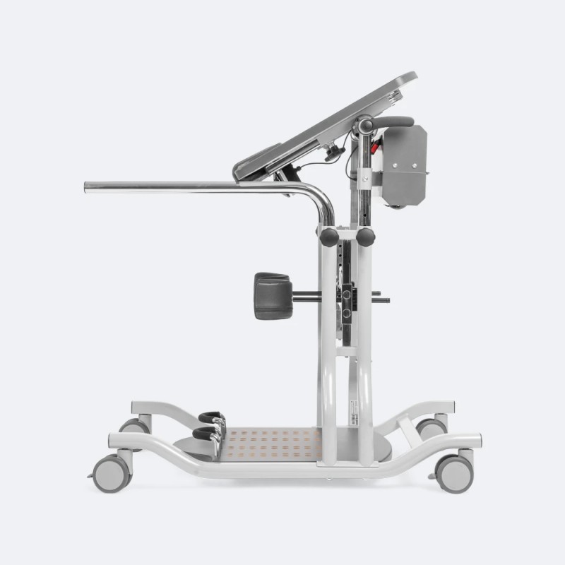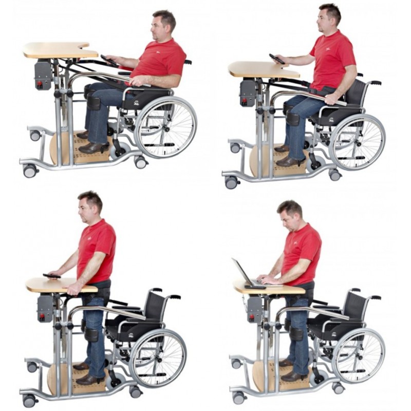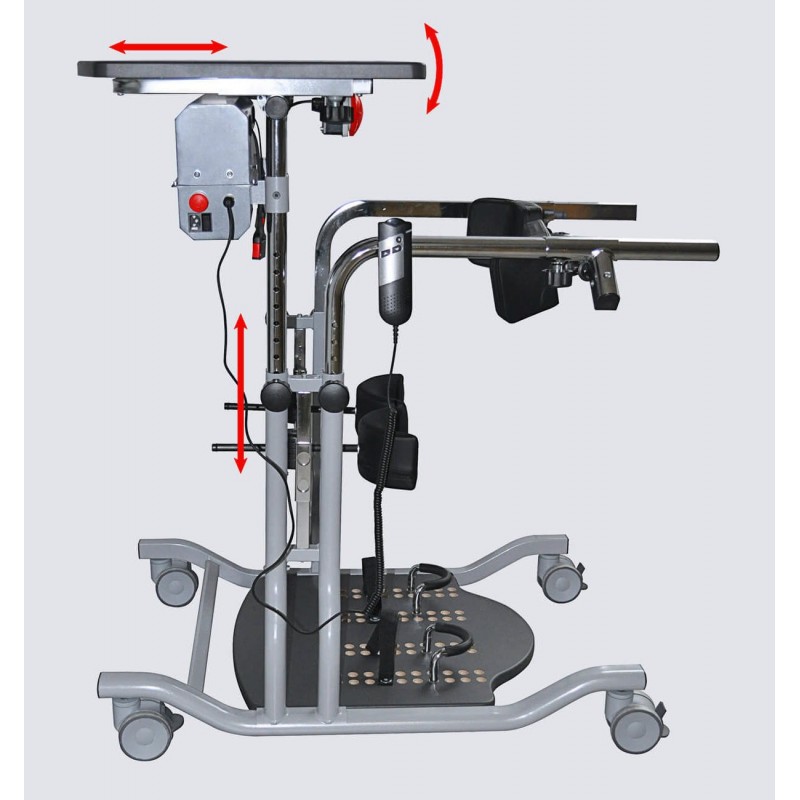 La tablette est réglable en hauteur, en profondeur et en inclinaison. Des appuis fessiers, tibiaux et cales pieds multi réglables assurent une station debout confortable.
